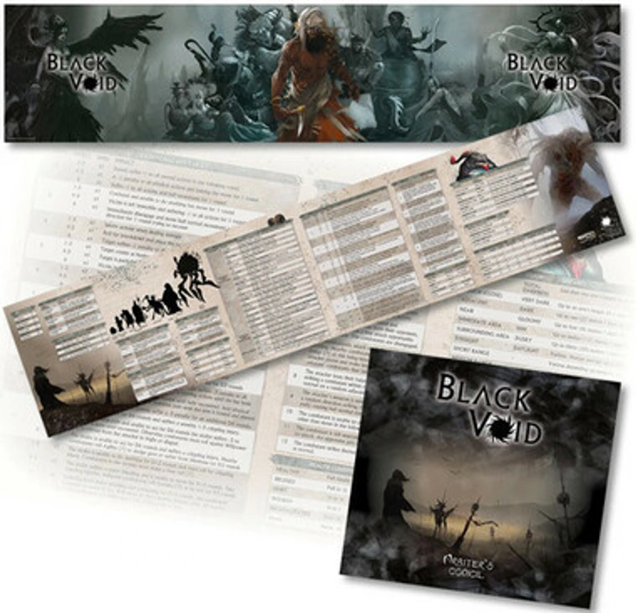 This four panel screen provides Arbiters with a practical barrier to shield notes and other information from the players as well as a range of convenient reference tables. The hand-picked cover art helps set the scene and enhance the ambient atmosphere on the gaming table for all your adventures in the BLACK VOID. The supplementary codicil contains additional tables and a creature size overview for easy reference.