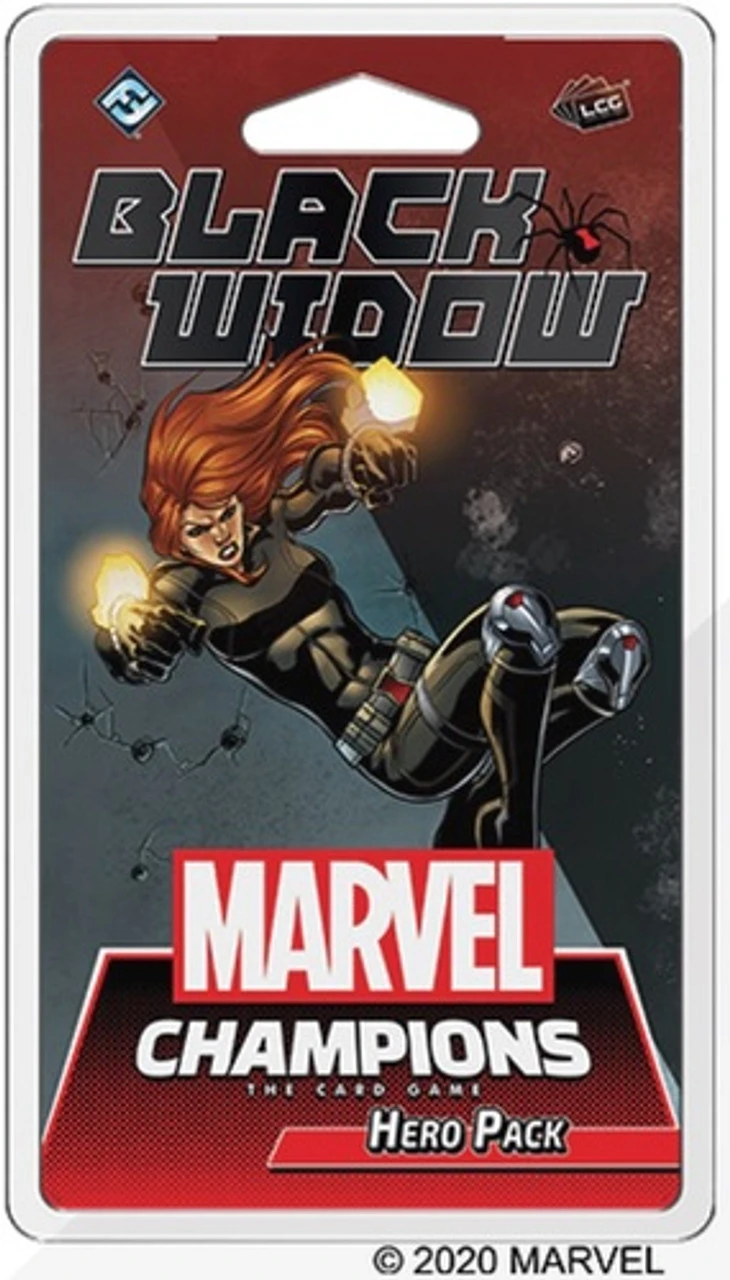 The Black Widow Hero Pack includes a pre-built deck for Black Widow utilizing the Justice aspect, the Taskmaster Nemesis set, and additional cards to help increase your deck building options!