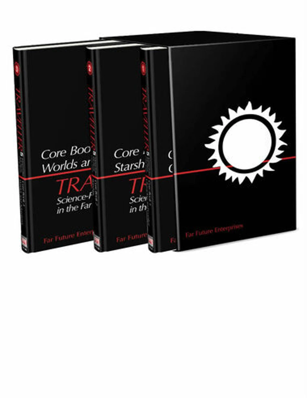 The ultimate edition of the Traveller Science-Fiction Role-Playing Game. Three hardcover 256-page books (all in a slipcase) Contains: Core Book 1- Characters and Combat. Core Book 2- Starships. Core Book 3- Worlds and Adventures. Traveller5 is the newest edition of the most popular and successful science-fiction role-playing settings of all time. Chronicling the high tech future of a star-spanning empire and thousands of worlds, species and cultures. Traveller is filled with challenges and adventure. With rules for character creation (including androis, genetic engineering, aliens and robots), combat, high technology, starships and more, Traveller5 has everything players need to start playing in the universe of the far future.