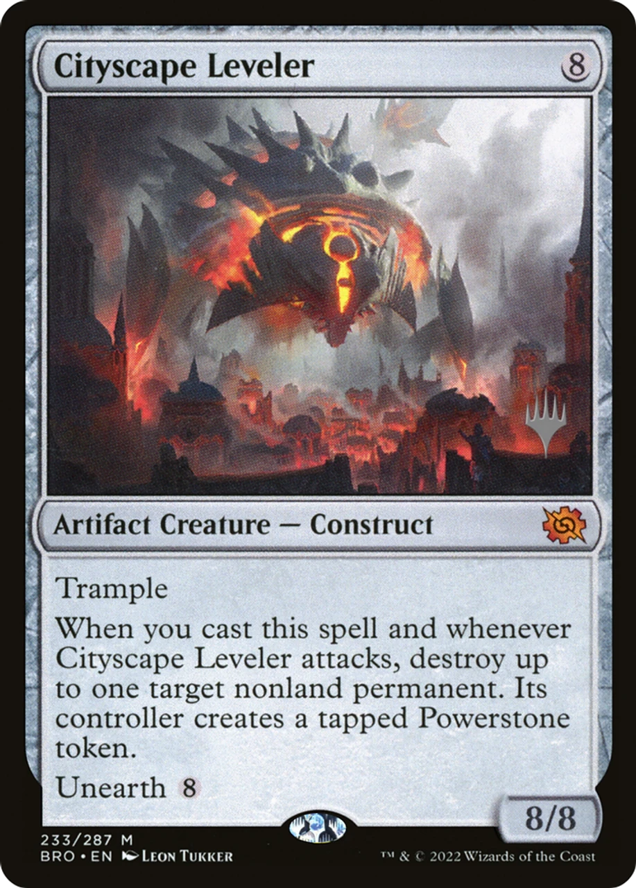 When you cast this spell and whenever Cityscape Leveler attacks, destroy up to one target nonland permanent. Its controller creates a tapped Powerstone token.