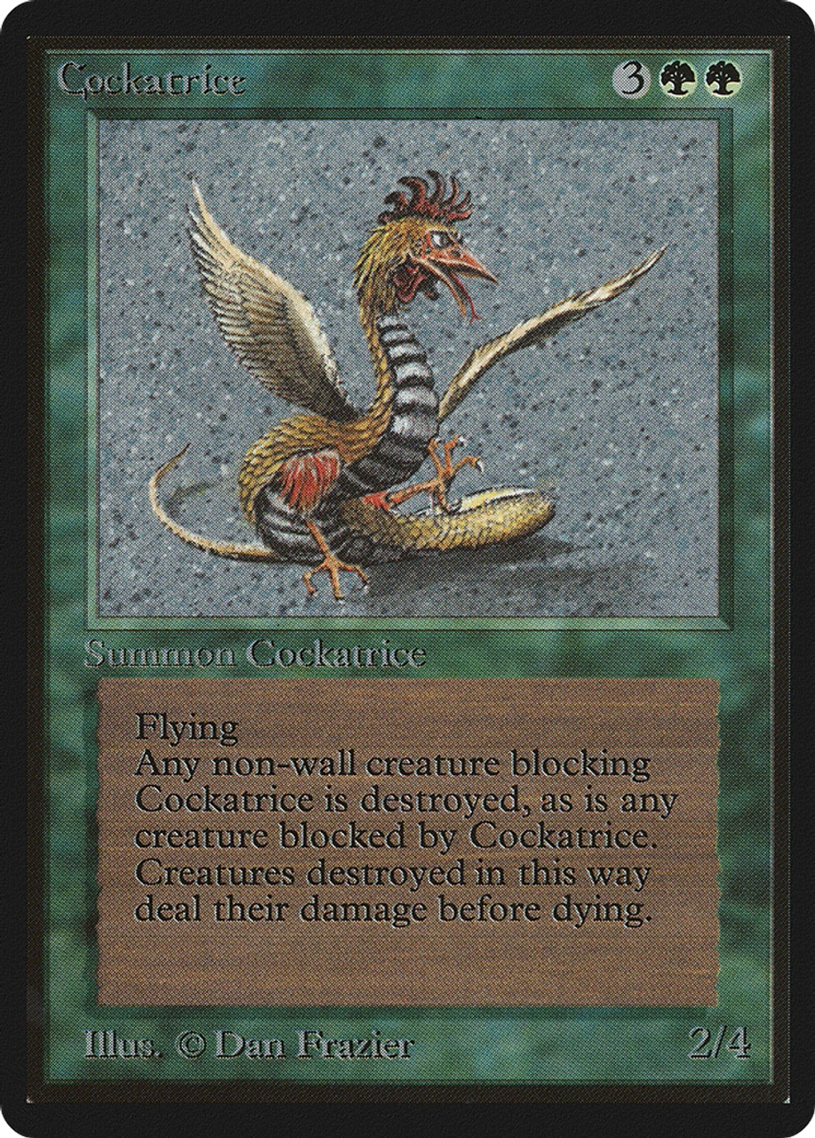 Whenever Cockatrice blocks or becomes blocked by a non-Wall creature, destroy that creature at end of combat.