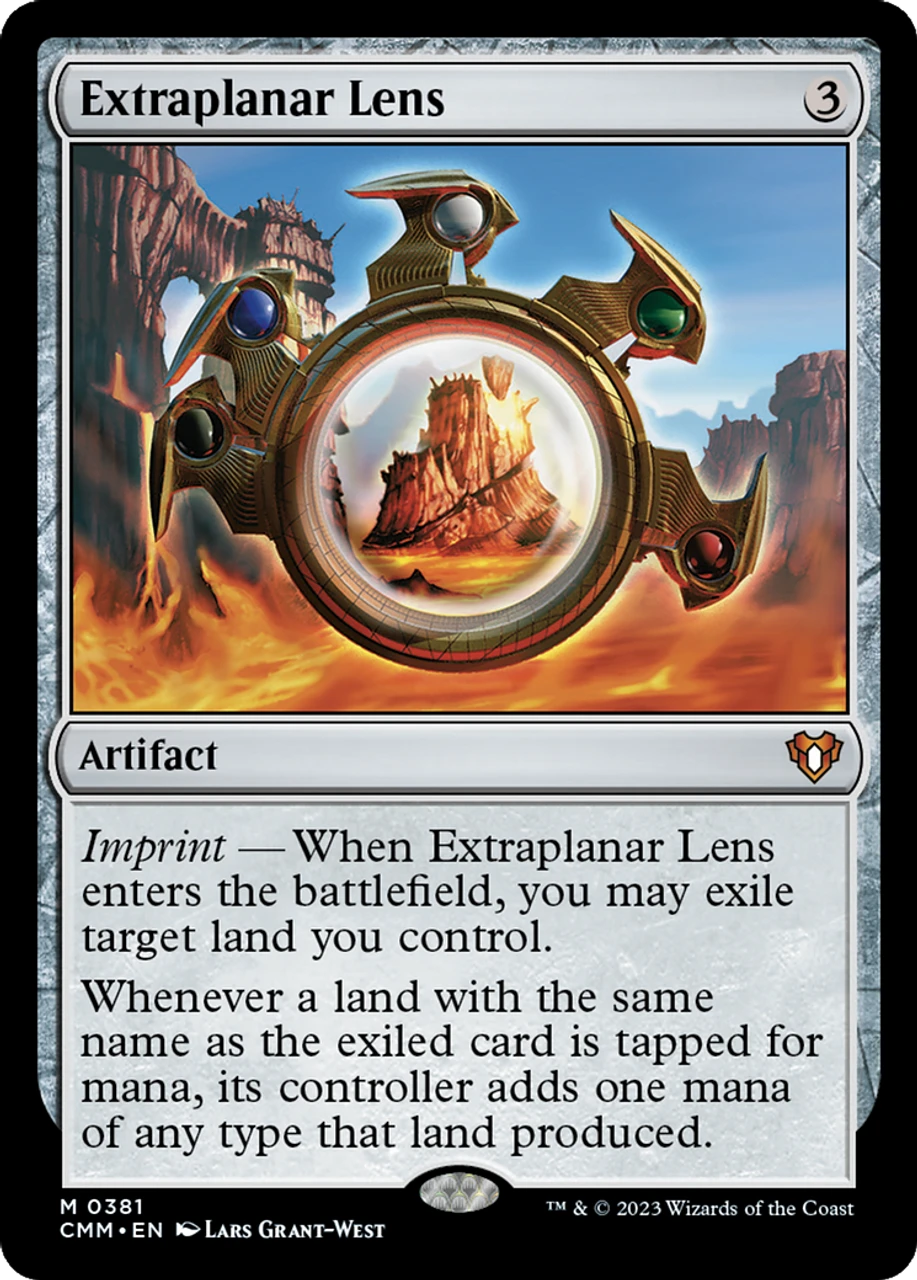 - Text: Imprint — When Extraplanar Lens enters the battlefield, you may exile target land you control.