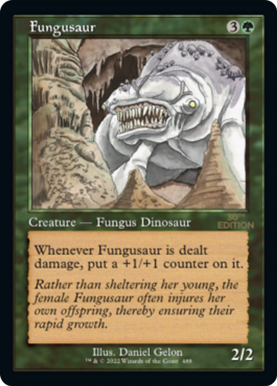 - Text: Whenever Fungusaur is dealt damage, put a +1/+1 counter on it.